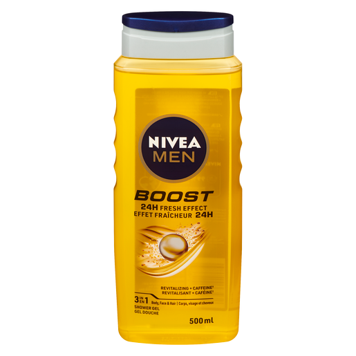 - NIVEA Boost shower gel for men, enriched with 100% naturally-sourced caffeine for a revitalizing shower